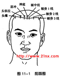 [位置]在头前部,从督脉神庭穴向前引一直线,长1寸。(图11-1)