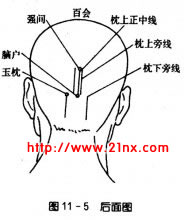 [位置]在后头部,由枕外粗隆督脉脑户穴旁开0.5寸起,向上引一直线,长1.5寸。(图11—5)