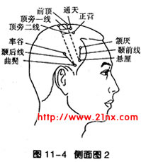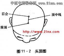 [位置]在头顶部,督脉旁1.5寸,从膀胱经通天穴向后引一直线,长1.5寸。(图11-4)