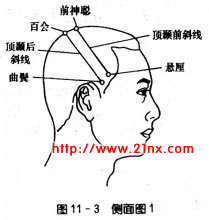 [位置]在头顶部、头侧部,顶颞前斜线之后1寸,与其平行的线。从督脉百会穴至颞部胆经曲鬓穴引一斜线。(图11-3)