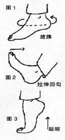 1.旋踝:自然站立,其中一脚站立,另一只脚旋转画圈,双脚交替进行,也可取坐位或仰卧位进行,最好是站立旋踝。每日一次或早晚各一次,每次15分钟左右。(如图1)